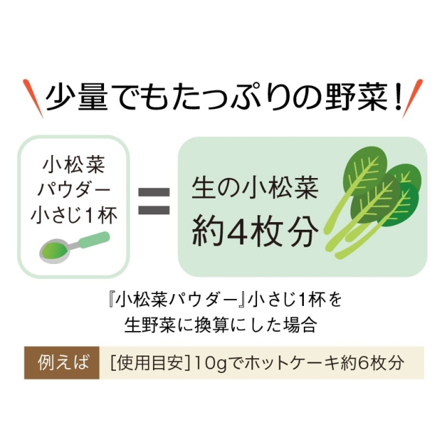 生の小松菜から約20分1のに凝縮されていますから、少量のファインパウダーで多くの小松菜が摂取できます。
